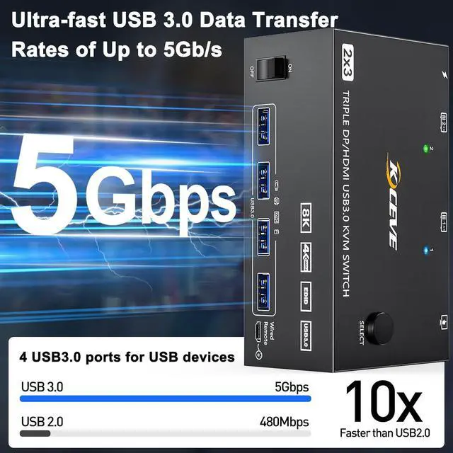 This 3 monitors KVM switch allows 2 computers to share 3 monitors and 4 USB 3.0 ports (for wired/wireless keyboard,mouse,webcam,Hard disk, etc.).
