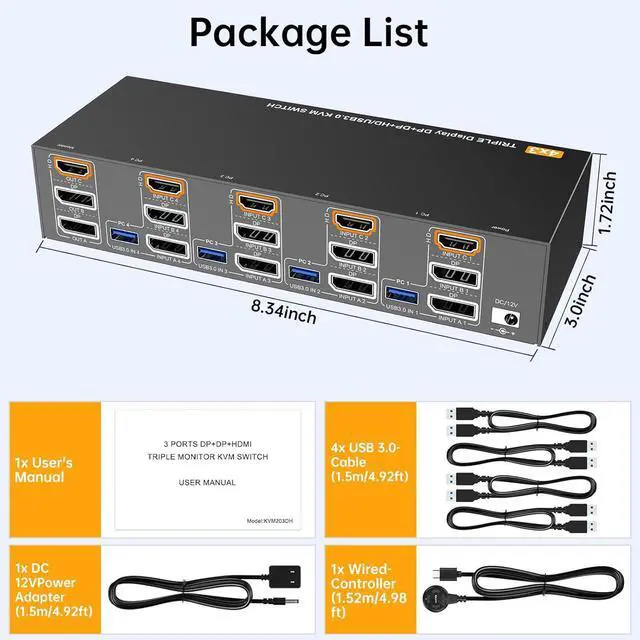 1*Triple Monitor USB 3.0 KVM Switch+4*USB 3.0 Cables( 1.5 m/ 4.9 ft)+1*Wired remote controller( 1.52 m/5ft)+1*User manual+1*12V Power Adapter( 1.52 m/5ft).