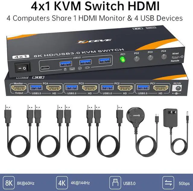 USB 3.0 KVM Switch 4 Computers 1 Monitor HDMI 8K@60Hz 4K@144Hz