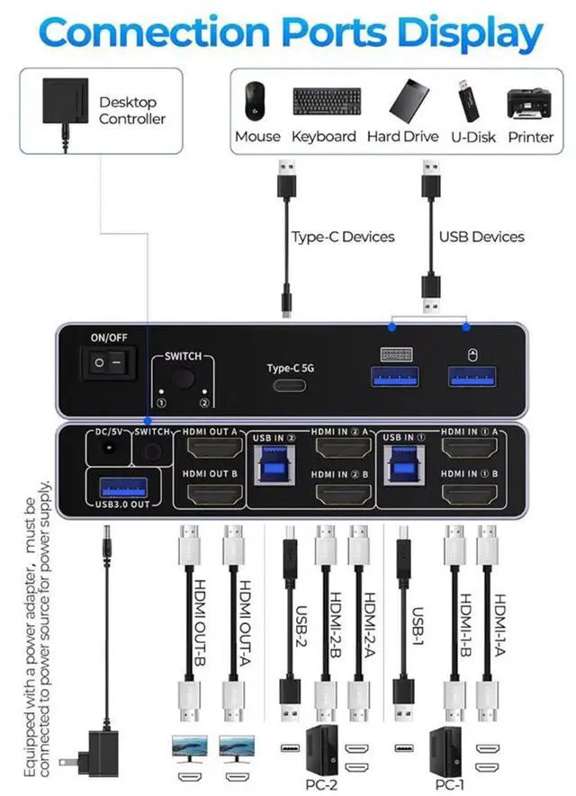 - This Dual Monitor HDMI KVM switch has 4 USB 3.0 ports (3 USB-A+1 USB-C) for sharing mouse, keyboard, USB flash drives, printer, and other USB devices.