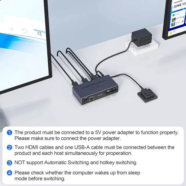 - 2 port HDMI KVM Perfects for hooking up 2 desktops or laptops to share 2 monitors and 1 set of keyboard, mouse