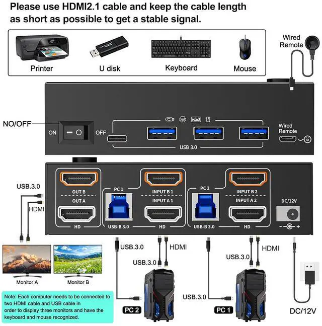 HDMI KVM Switch with 3 USB 3.0 and USB-C Ports The dual-monitor KVM switch allows two computers to share two monitors and four USB devices. Supported devices include keyboards, mice, printers, scanners, USB drives, and other USB peripherals. : Connect the included USB cable to the USB port of PC1/PC2 and the computer. Otherwise, the USB devices will not be recognized.