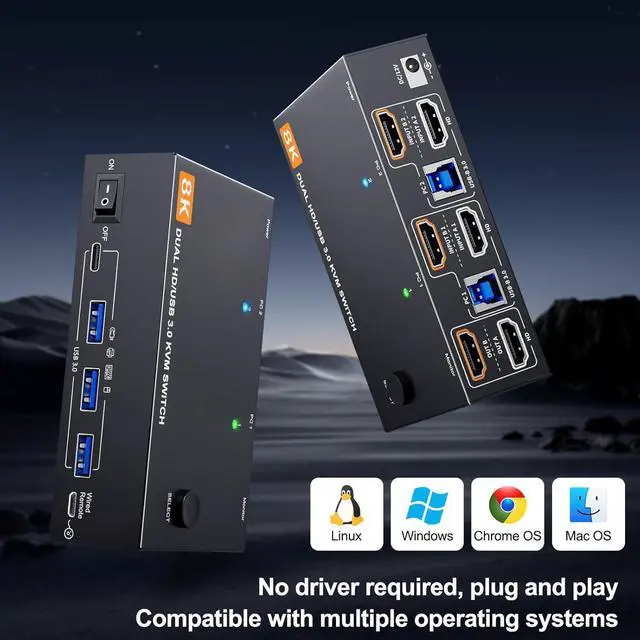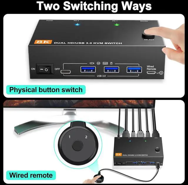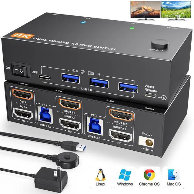 8K Dual-Monitor KVM Switch This dual-monitor KVM switch is ideal for connecting two desktop PCs or laptops to share a wired or wireless keyboard and mouse, as well as two monitors (supports extended and mirrored display modes).