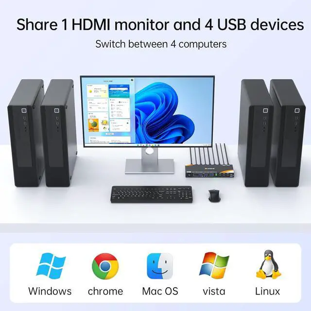 Plug and play, no software installation required. A set of keyboard mouse controls 4 computers, sharing 1 HDMI monitor, suitable for users with Multiple computers