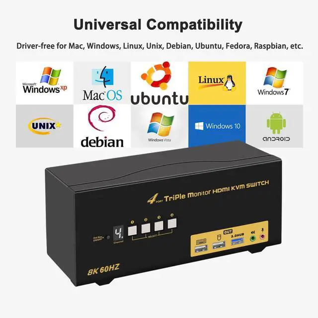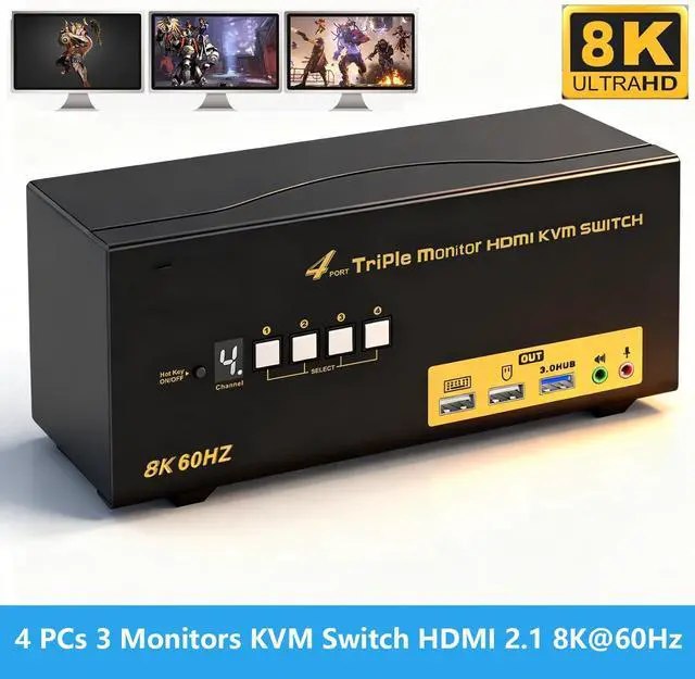 4 Port HDMI KVM Switch Triple Monitor 8K@60Hz 4K@120Hz Supports Audio and Microphone