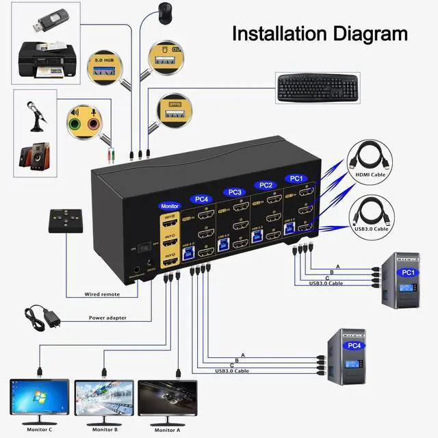 - Computer 4: Connect 4 HDMI outputs from computer 4 to PC4 IN A, B ,C ports; Connect USB A-male to USB 3.0 port on computer 4, and USB B-male to USB 2 input on the KVM switch;