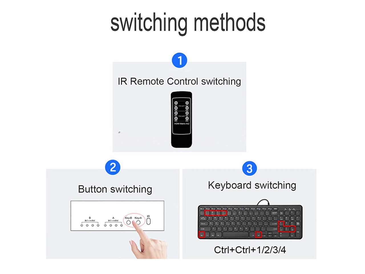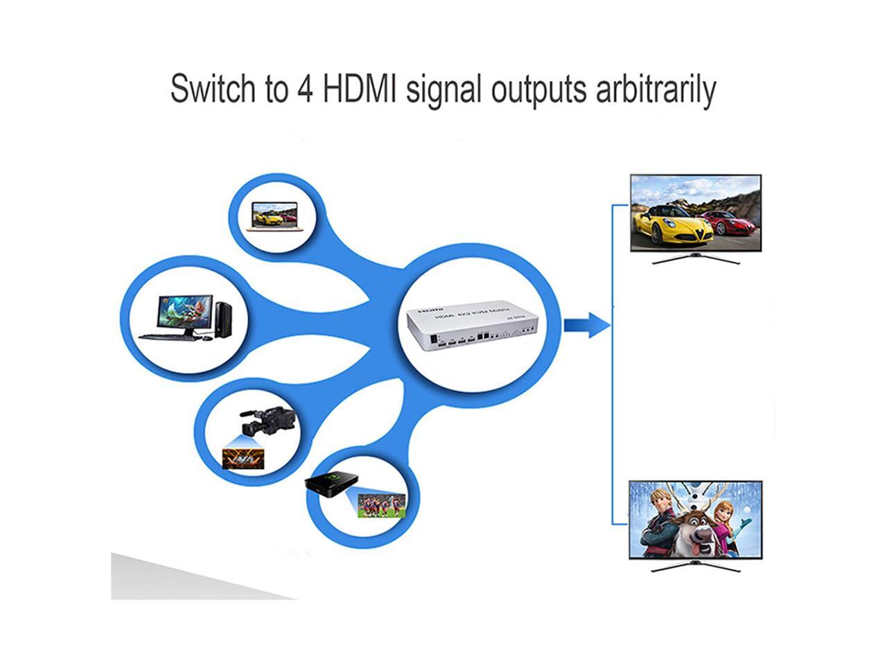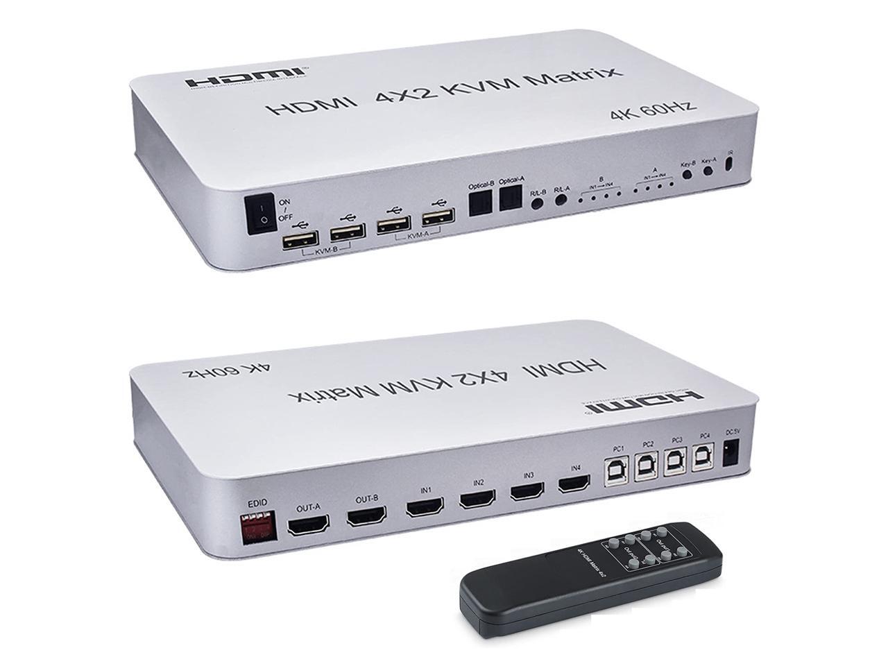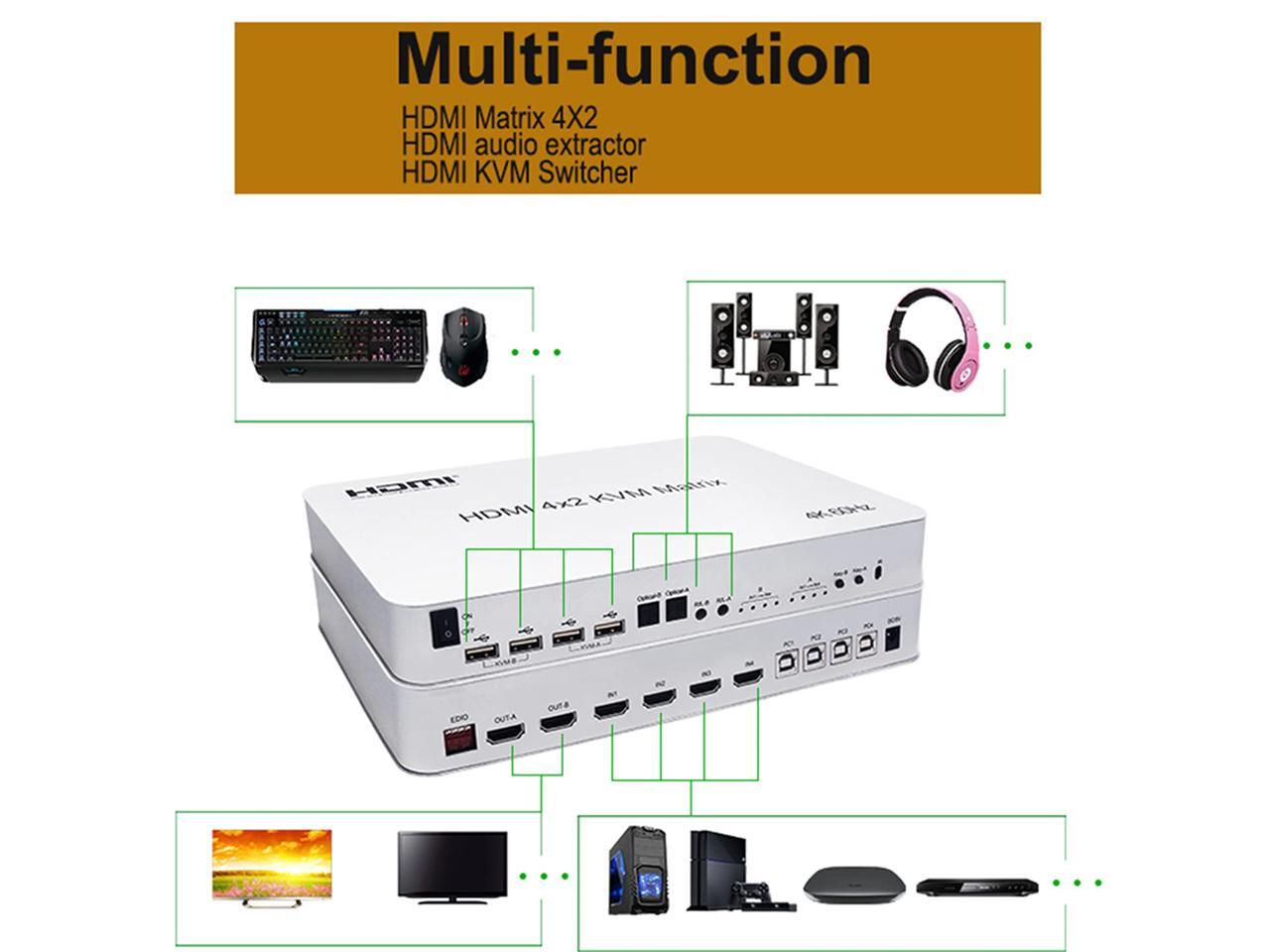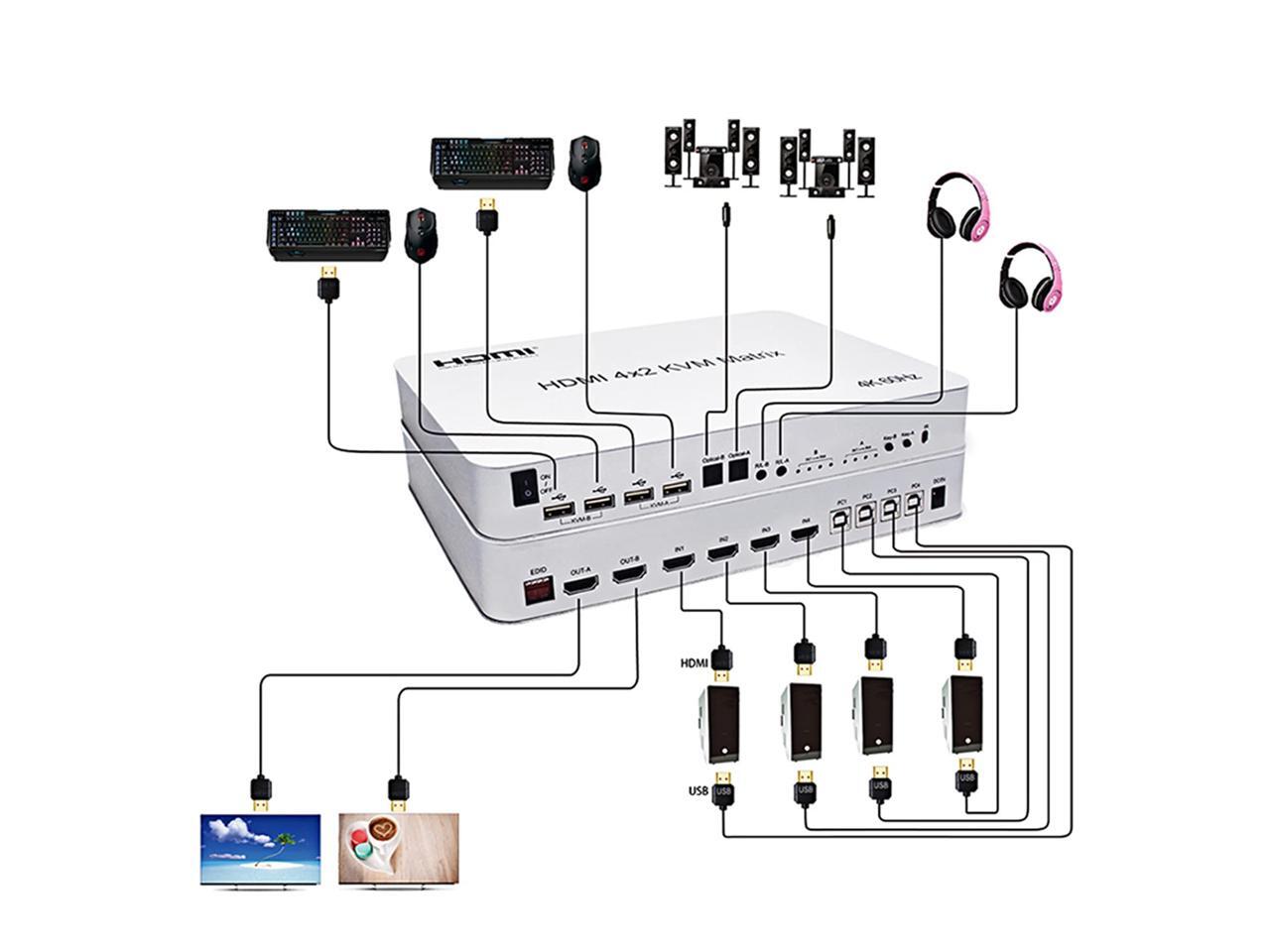 - 1. This HDMI-compatible 4X2 KVM matrix, it can switch between 4 input signal source devices, and distribute the signal to 2 monitors (2 monitors can display the same picture or different pictures) and any one output All ports can realize independent audio output through Optical SPDIF or 3.5mm audio jack.