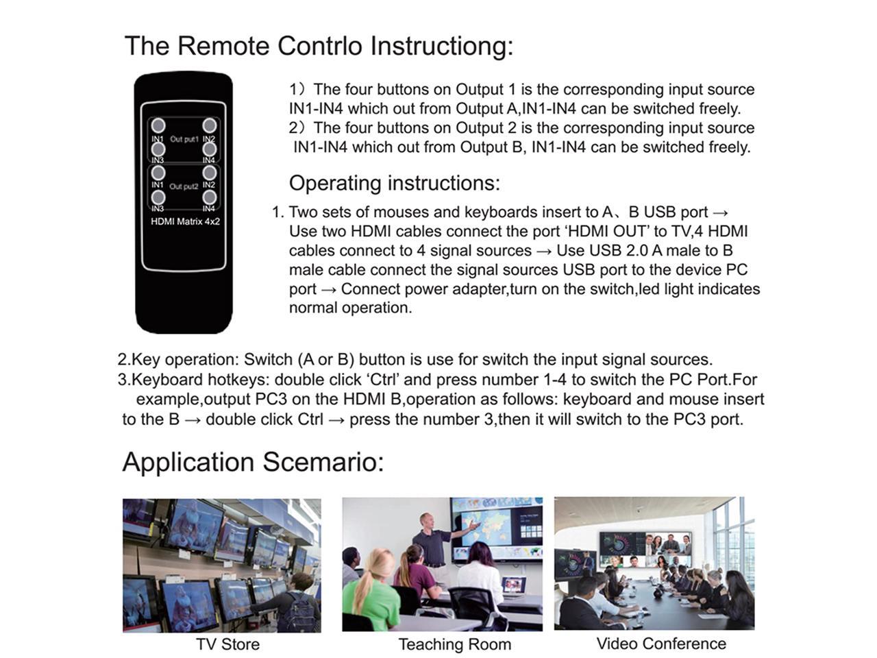 - 5. This HDMI 4X2 KVM matrix is suitable for entertainment centers, retail and websites, high-definition TV set-top boxes, DVDs, projector factories, data center control, information distribution, meeting rooms, schools etc..