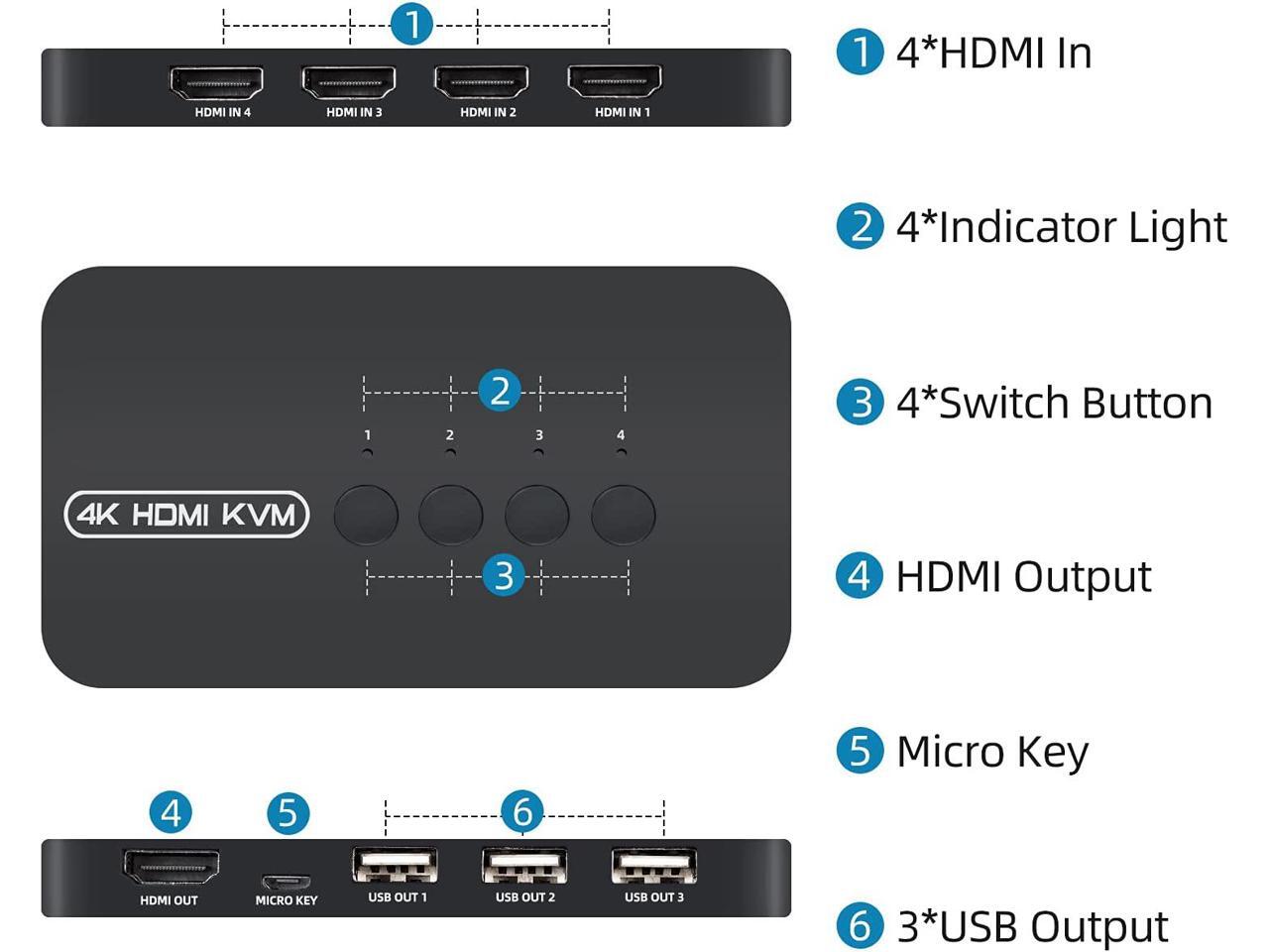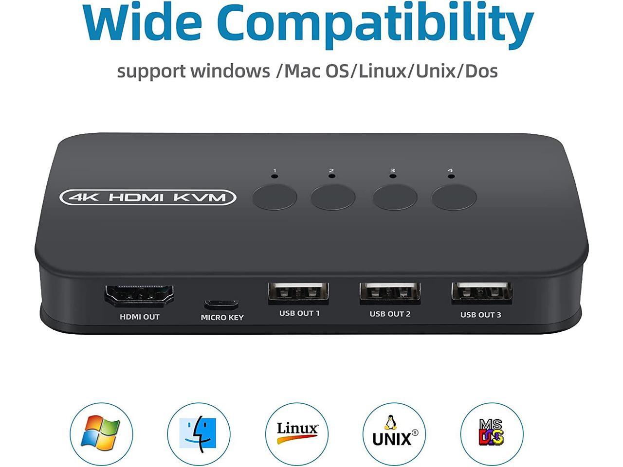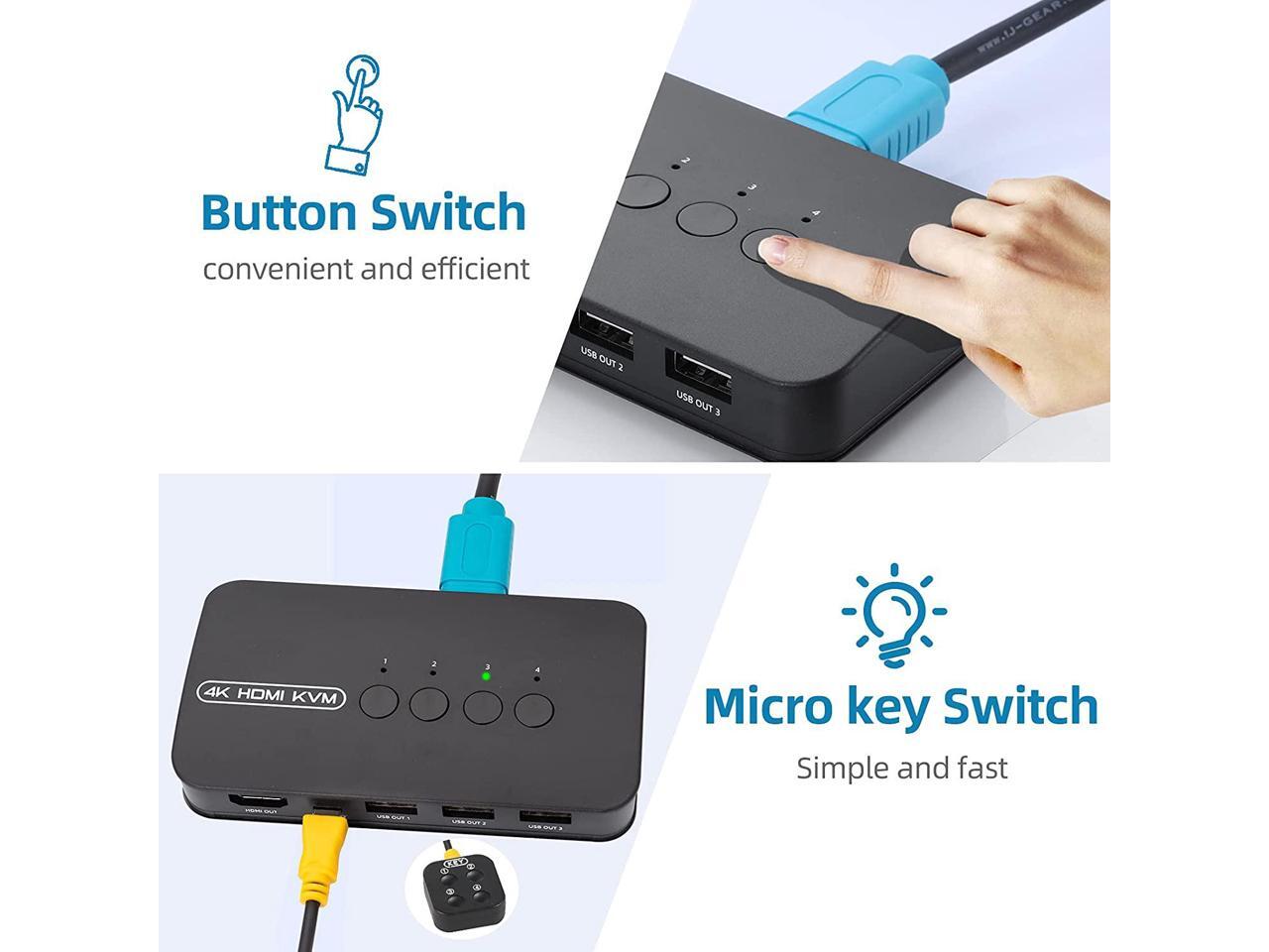 - Ideal Sharing Switches: The HDMI USB KVM Switch can share one HD 4K monitor and 3 USB 2.0 devices such as scanner mouse keyboard between 4 computers.