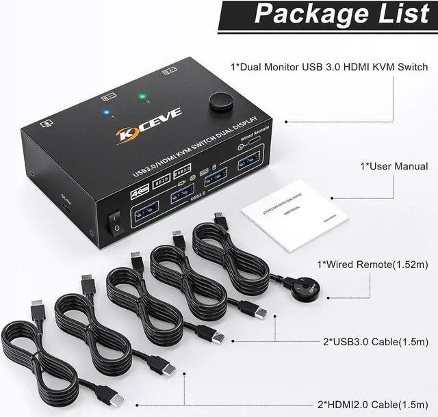 1, This dual-monitor HDMI KVM can control 2 computers sharing 2 monitors with 1 set of USB keyboard and mouse. Please connect all cables to make 2 displays work properly.