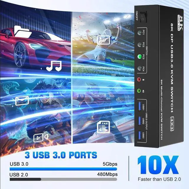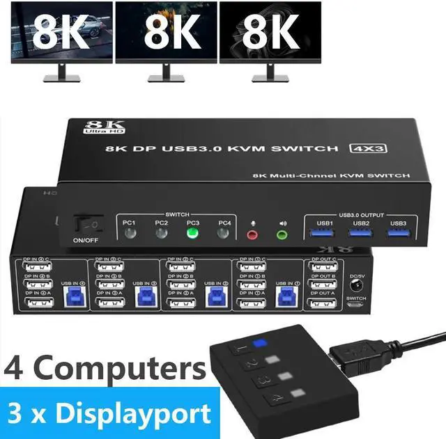 8K 60Hz 4x3 Displayport USB 3.0 KVM Switch allows you to share one USB keyboard, USB mouse, and three DP monitor to control 4 computers, laptops, game consoles.