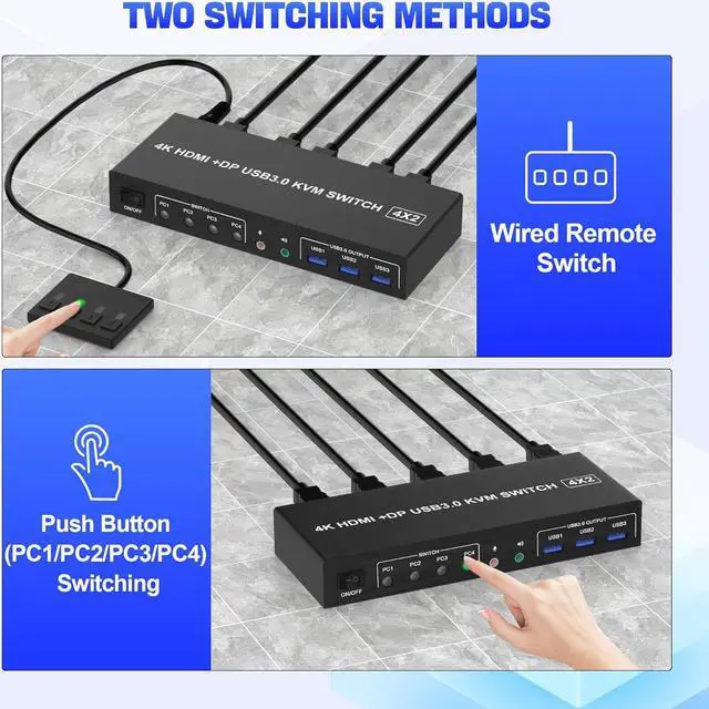 - 4 computers/laptops share one set of keyboard, mouse and dual monitors, and more USB 3.0 ports;