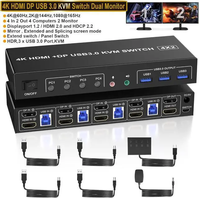 Dual Monitor 4 Port HDMI + Displayport USB 3.0 KVM Switch 4K@60Hz