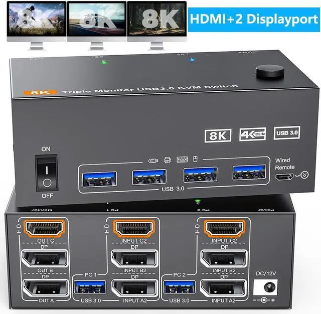 8K@60Hz/4K@144Hz Triple Monitor 2 Displayport1.4 + HDMI2.1 KVM Switch