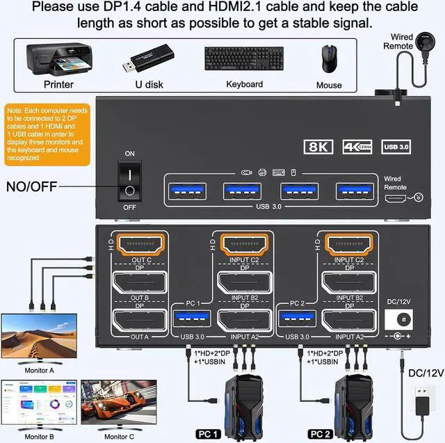 This KVM Switch allows 2 computers to share 3 monitors and 4 USB3.0 ports(keyboard,mouse and other USB devices).It can make your work space tidy and efficient, also a premium choice for working from home.