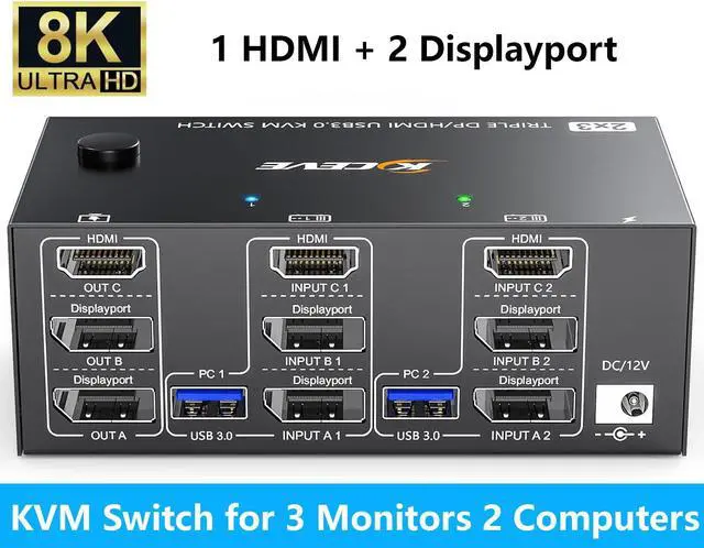 KVM switch 3 monitors driver-free for Windows, Mac, Linux, Unix, Ubuntu. Support PC, Laptop, PS4, Raspberry Pi, DVR, NVR.it is widely applied for home,Office,Game,Meeting,etc..