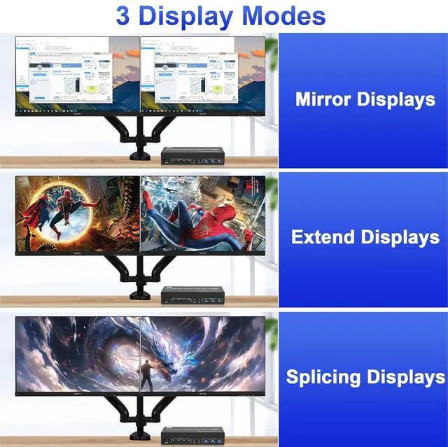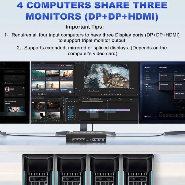 - 4 computers / laptops share one set of keyboard, mouse and 3 monitors (HDMI+2 DisplayPort)