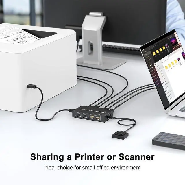 - 3xUSB ports:This KVM switch features 3 standard USB ports. It allows you to seamlessly share peripherals like printers and external drives between two computers, reducing clutter and enhancing efficiency. Ideal for sharing USB devices such as keyboards, mice, scanners, printers, and flash drives, this KVM switch automatically detects and matches connected devices on both computers.