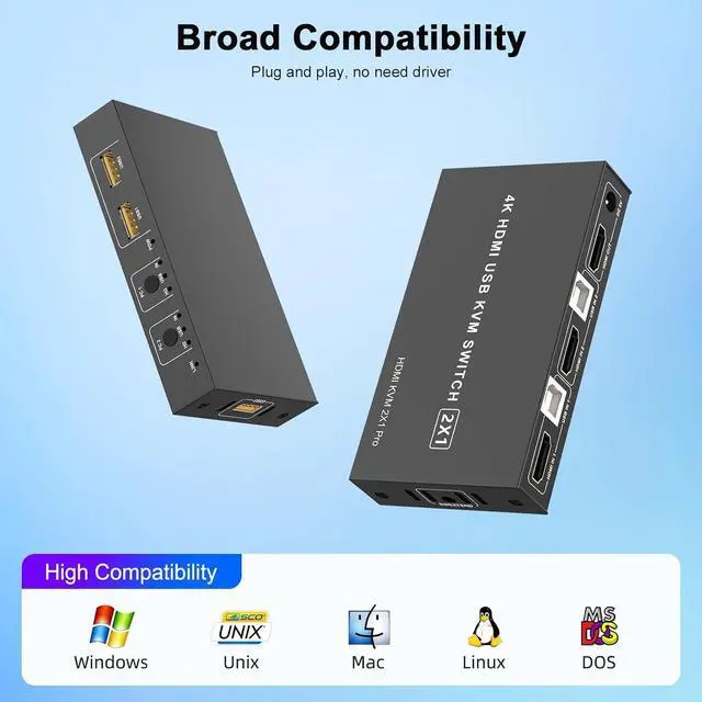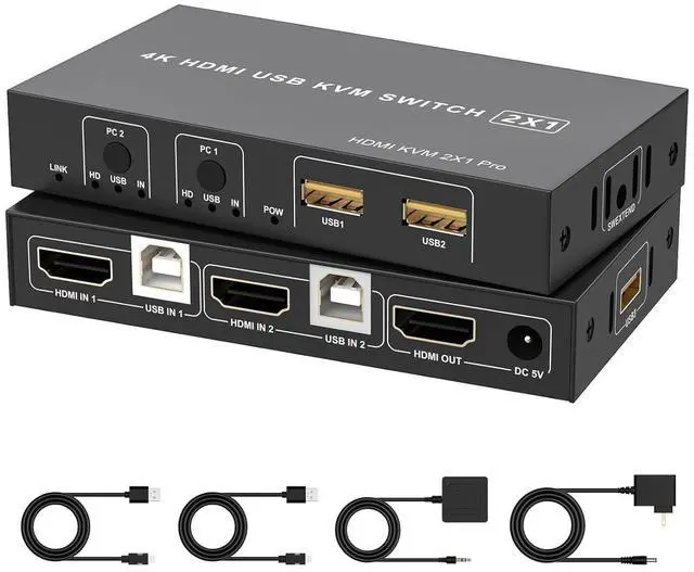 - KVM Switch 1 Monitor 2 Computers:This HDMI KVM Switch with 2 HDMI ports allows control of 2 Computers while sharing 1 monitor and 3 USB devices along with a single keyboard and mouse,it's a complete USB switch and HDMI switch rolled into one. This KVM Switch HDMI also supports various input devices such as PC, Laptop, PS4, etc. It is compatible with a variety of operating systems including Windows 7/8/10/11/Vista/XP, Linux, Mac, and more.