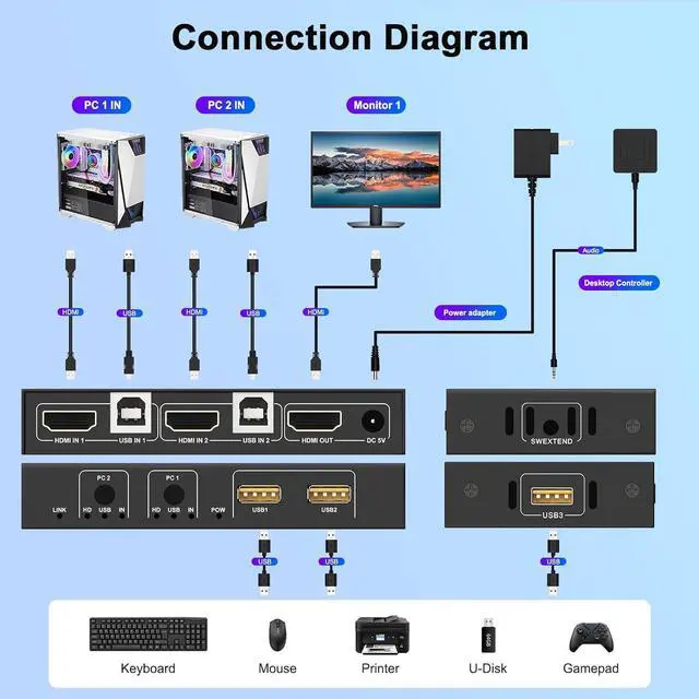 - Adaptive EDID & Plug and Play:This USB HDMI KVM Switch features Adaptive EDID, ensuring stable and smooth image transmission by automatically optimizing display settings on your monitors. Easy to install, this HDMI KVM switch requires no power supply or driver softwarejust plug it in and connect all cables for seamless operation between two computers and one monitor.