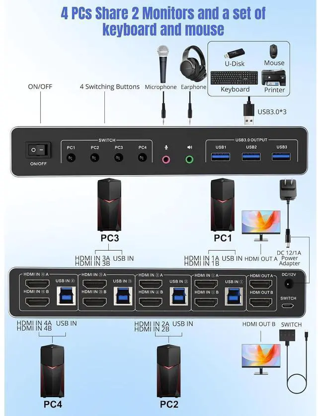 - 4 computers share one set of keyboard, mouse, 2 monitors, and more USB 3.0 peripherals.