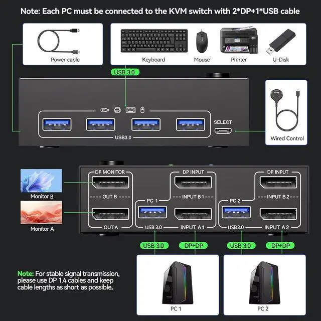 Each computer requires simultaneous connection of 2 DP + 1 USB cable to the 2 monitors KVM switch. This is a Displayport KVM Switch.