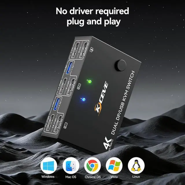 Connect 2 computers to 2 external monitors, plus keyboard, mouse and other USB peripherals for one-click switching and space-saving workspace.