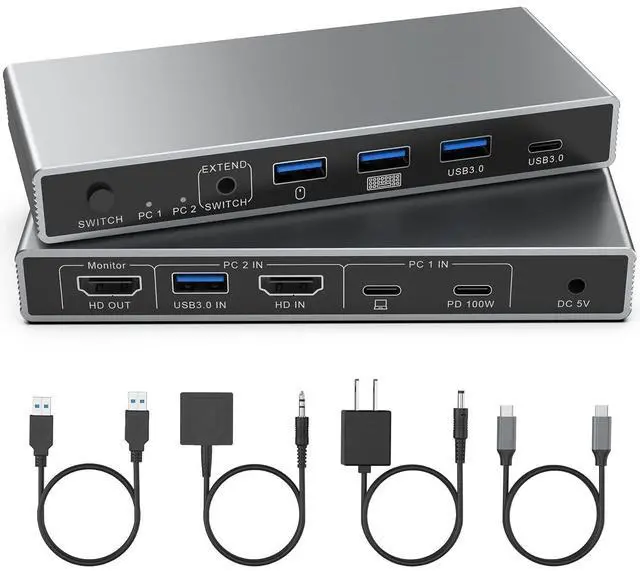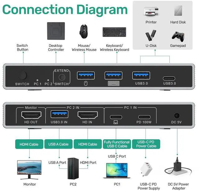 USB-C+HDMI KVM Switch for 2 Computers 1 Monitor: Connect 2 computers (e.g., a USB-C laptop and a standard HDMI PC) to a single monitor, sharing up to 4 USB peripherals including keyboard, mouse, hard drive, and printer. Seamlessly switch between work, gaming, or home setups with the press of a single button of 4k KVM switch. Note: For the HDMI computer, both an HDMI cable (video) and a USB-A to C cable (data) are required for full functionality.
