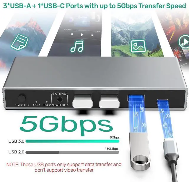 KVM Switches with 4-Port USB 3.0 Hub: USB C KVM switch includes 3 USB-A 3.0 ports and 1 USB-C port for connecting peripherals like mouse, keyboard, flash drives, external hard drives, printers, etc. HDMI KVM switch achieve transfer speeds up to 5 Gbps with USB 3.0, making file transfers fast and efficient. Note: Please connect the included 5V power adapter for use. (To charge your laptop, connect its power adapter directly to the PD port on the switch.)