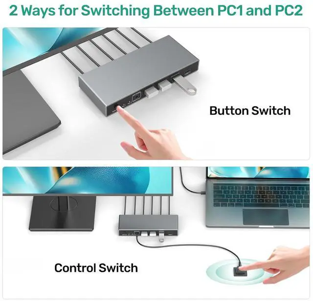 Two Ways to Switch and LED Indicator: KVM switch 1 monitor 2 computers easily toggle between computers using either the physical button on the switch or the included desktop controller. Then you can see which computer is connected via the indicator light. This USB-C KVM switch clutter-free setup saves desk space and boosts productivity. (Note: Does not support automatic or hotkey switching.)