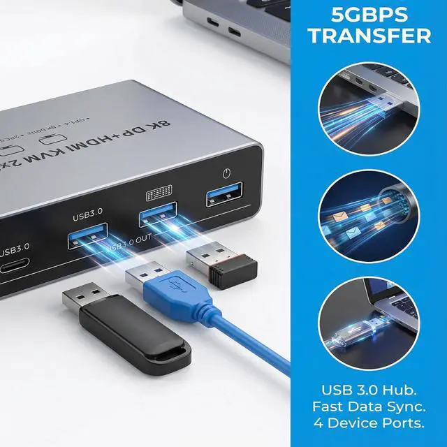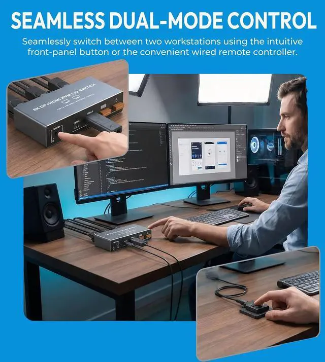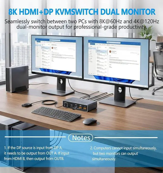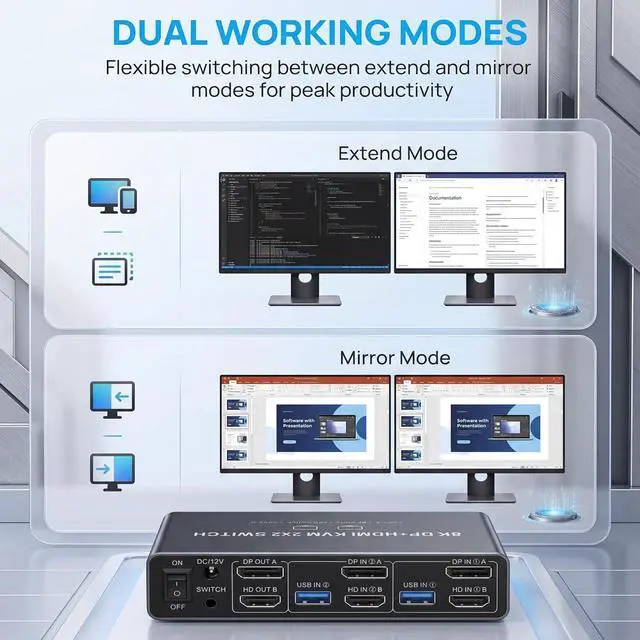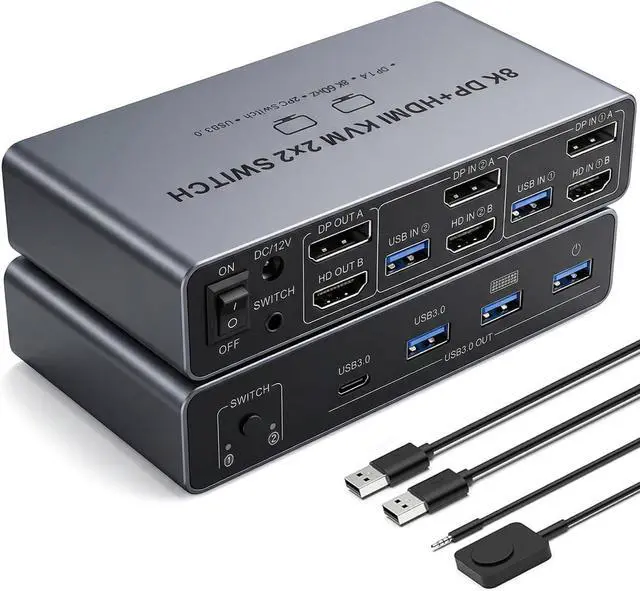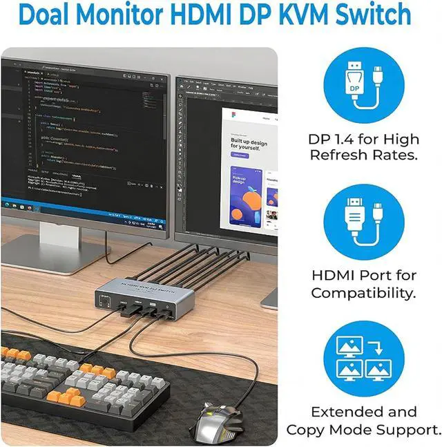 KVM Switch 2 Monitors 2 Computers - Dual Monitor KVM Switch with HDMI2.1 + DP1.4, 4 USB 3.0 Ports, Easy Switching, and Stable Work