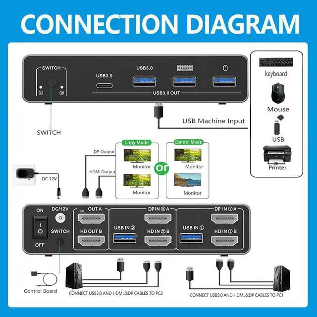 - Dual Monitor KVM Switch: Seamlessly switch between two computers or laptops while sharing two HD monitors and 4 USB 3.0 ports, including mouse, keyboard, printer, U disk, or gamepad.