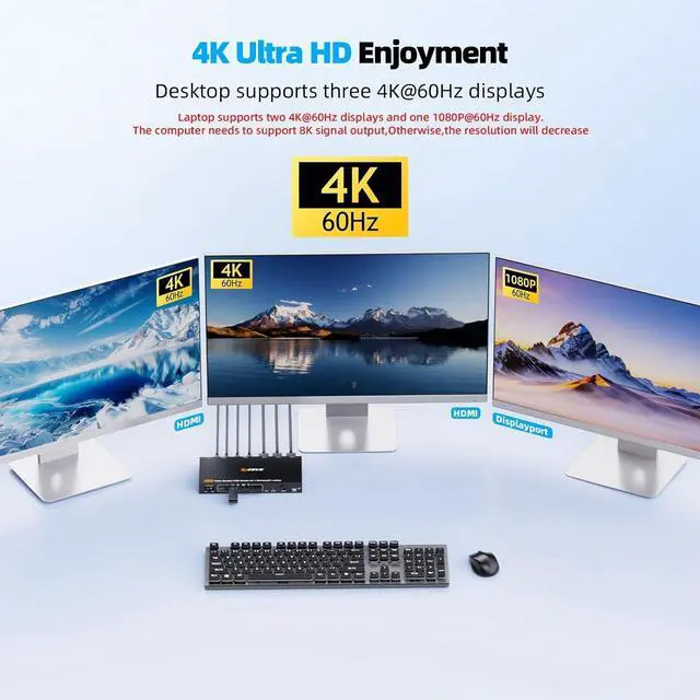 Supports expansion of mainstream systems with simultaneous output of 3 external displays.Supports triple 4K@60Hz when connected to a desktop.Support two 4K@60Hz and one 1080P@60Hz when connected to a laptop.