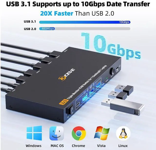 3 Monitors KVM switch enables seamless switching between 1 Laptop and 1 Desktop, sharing 3 external monitors and 4 USB peripherals