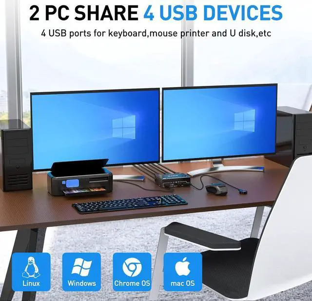 Easy to Use & 2 Switching MethdosAOOCOO dual monitor KVM switch driver-free for most computer operating systems and plug and play. Pressing the button on the panel or use the wired remote controller (included in the package) to switch the computers. Two-color indicator light will show which computer switch to.