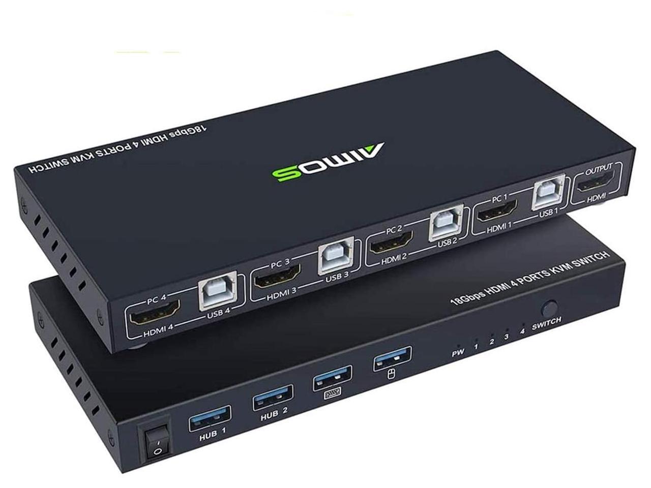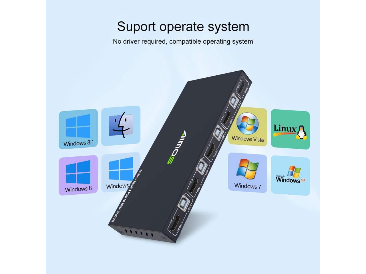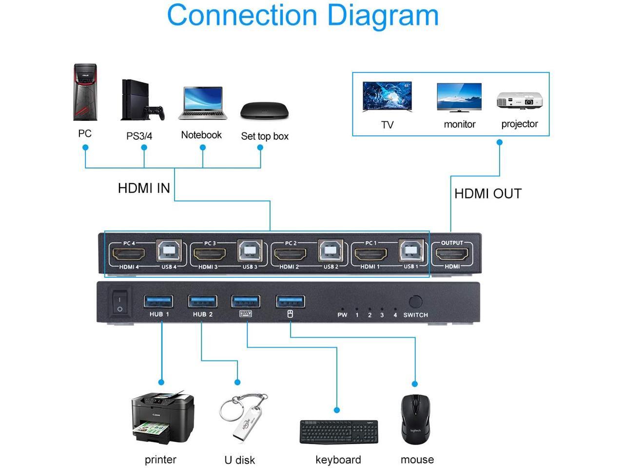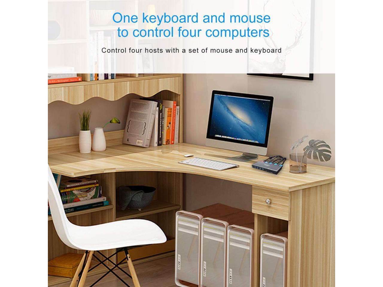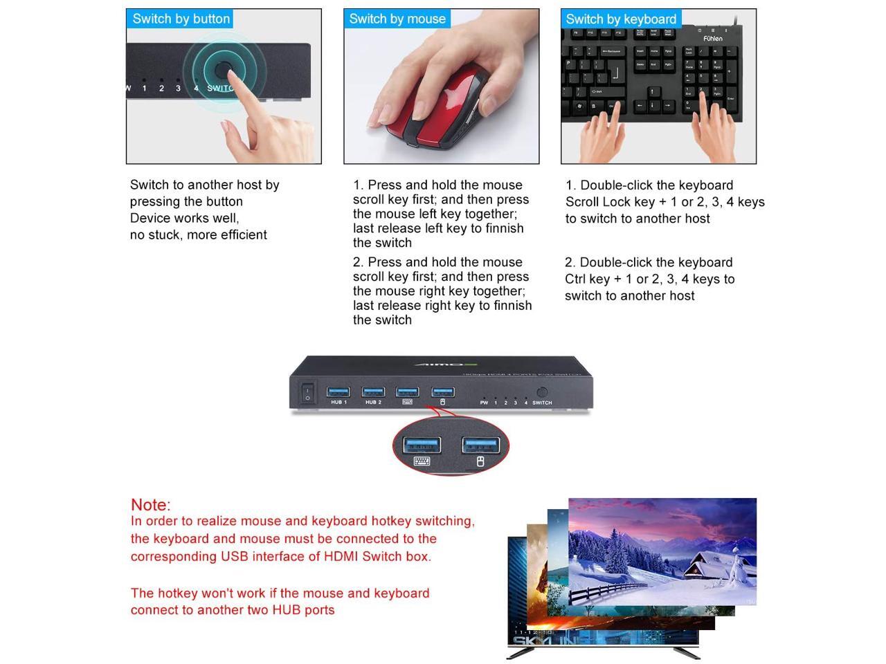- [USB 2.0 HUB Port and Hot key switch] support wireless keyboard and mouse. Supports other usb device such as USB drive/Scanner/3D Printer/Monitor Camera. Support physical button and keyboard hot key switching way.(hotkey: Scroll Lock, Scroll Lock, 1/2/3/4) or (Ctrl, Ctrl, 1/2/3/4).