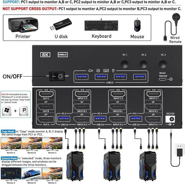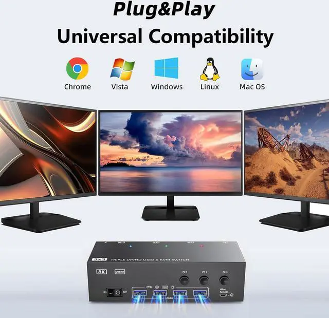 3 PC 3 Monitor Switch Supports a maximum of 8K@60Hz(7680*4320), 4K@60Hz (3840 × 2160) Ultra HD image quality, and also supports other lower