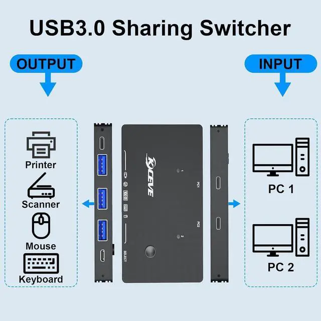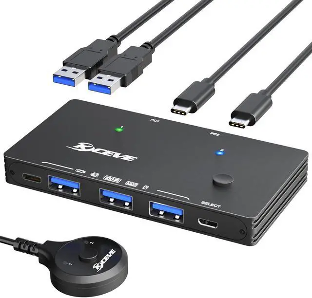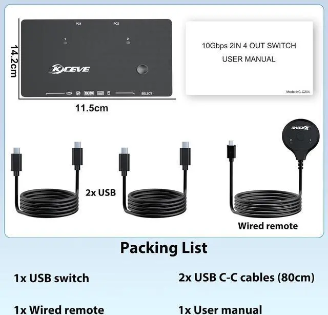 USB 3.2 Switch * 1 ( 4.8 x 2.1 x 0.7 Inches); USB C to C Cable * 2 ( 2.6FT / 0.8M ); Wired Remote Control *1 (5FT/ 1.5M ).