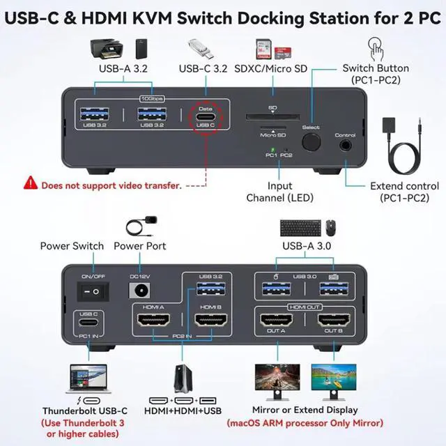 4K 60Hz USB C + HDMI KVM Switch allows you to share one USB keyboard, USB mouse,3x USB 3.2 device,1 x SD Card,1 x micro SD card and two HDMI 2.0 monitor to control 2 Macbook,computers, laptops, game consoles.