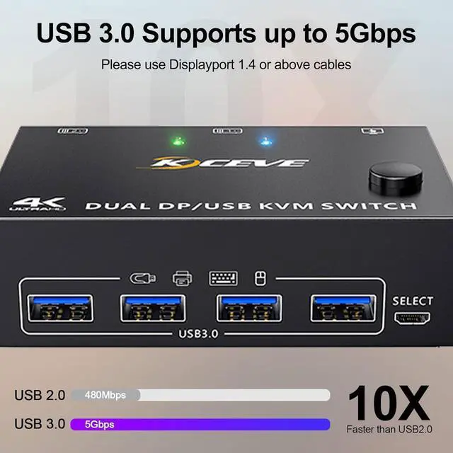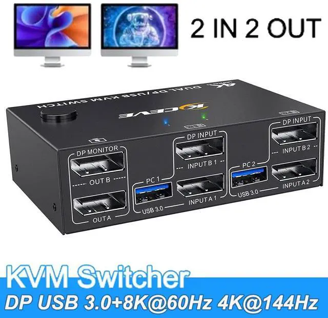 Dual DisplayPort KVM Switch 2 Computers Share 2 Monitors and 4 USB 3.0 Ports