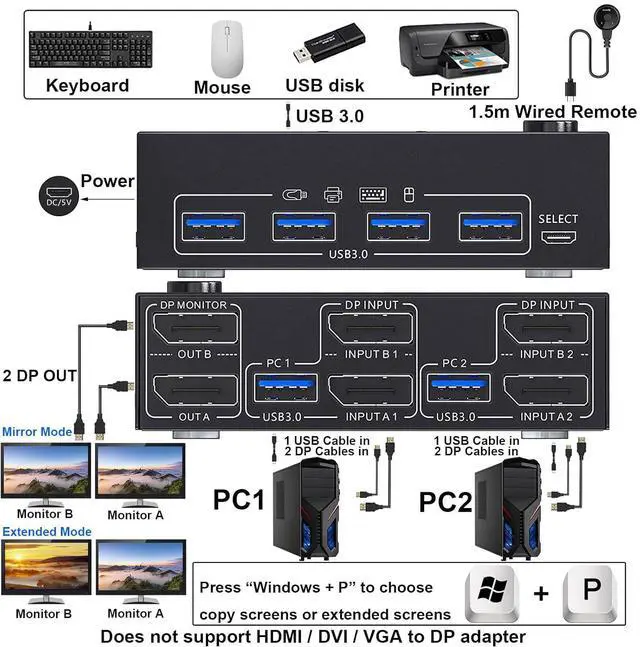 KVM switch 2 monitors 2 Computers share a set of wired / wireless mouse, keyboard, printer, scanner or webcam, and display on 2 monitors