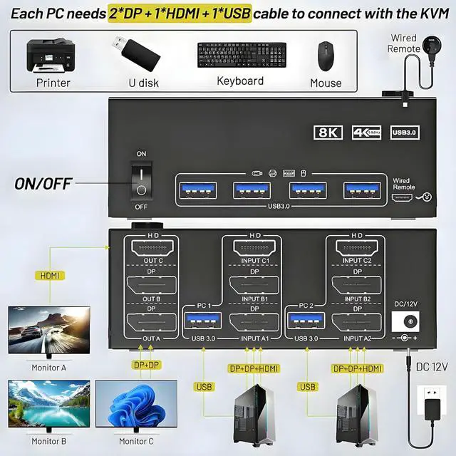 The upgraded 12V power adapter makes the Triple monitors KVM switch work smoother and provides more stable recognition when connecting high-power USB devices