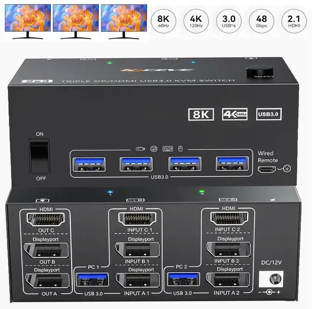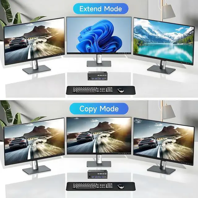 - This KVM switch 2 computers 3 monitors perfect for hooking up 2 desktops or laptops to share one set of wired or wireless keyboard mouse and 3 monitors (supports extended and mirrored display modes).