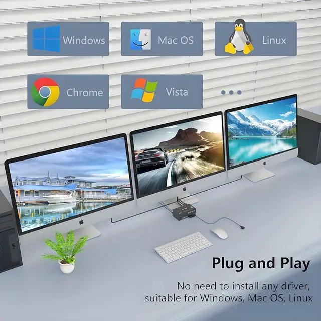 This 3 monitor KVM switch driver-free for Windows, Mac OS, Linux and Chrome OS. Compatible with PC, Laptop,TV Box. It is widely applied for home, office, teaching, games, etc.