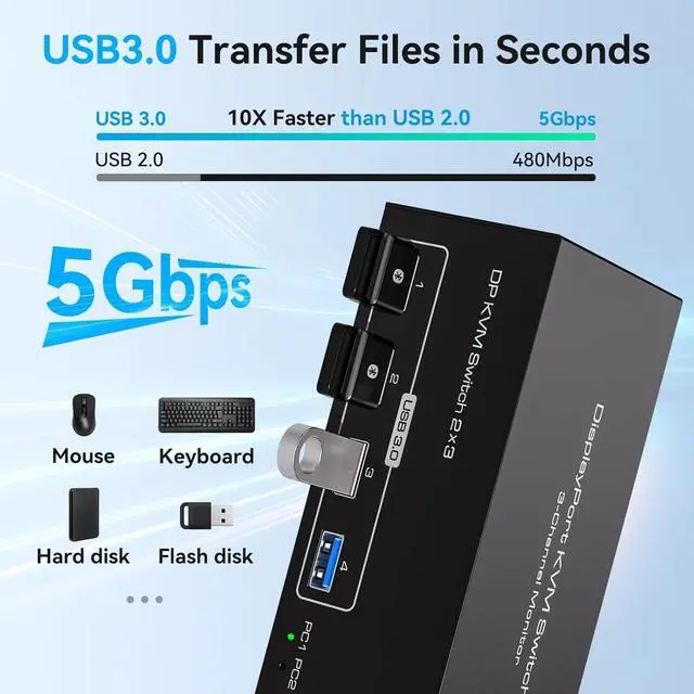 USB 3.0 KVM switcher with four USB 3.0 ports, Maximum transfer rate is up to 5Gbps, Enables efficient file sharing and transfer between computers and peripheral devices. Backward compatible with USB 2.0 and 1.1, it supports USB devices such as keyboards, mice, printers, hard disks, scanners and webcams.