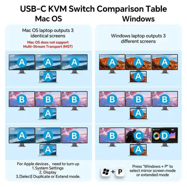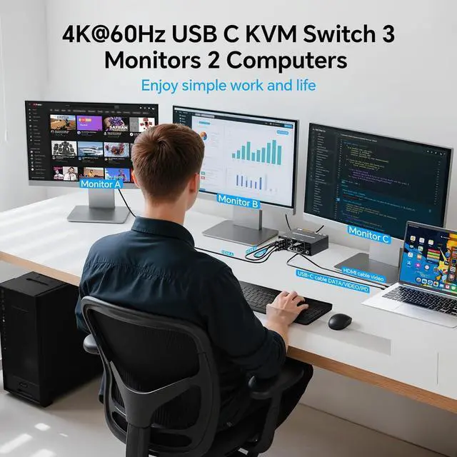 | Application | This KVM switch enables control of 2 computers with 3 monitors through a HDMI/USB C matrix. It also allows shared use of 3 USB 3.0 devices (such as keyboards, mouse, printers, and cameras) and 1 USB C port via a single hub—cutting down on desktop clutter while increasing multitasking efficiency by 20%. |