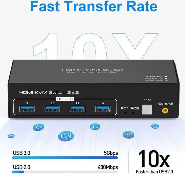 - Dual Monitor HDMI KVM Switch 8K 60Hz, can connect 2 computer hosts sharing 1 set of keyboard, mouse and 2 monitors.
