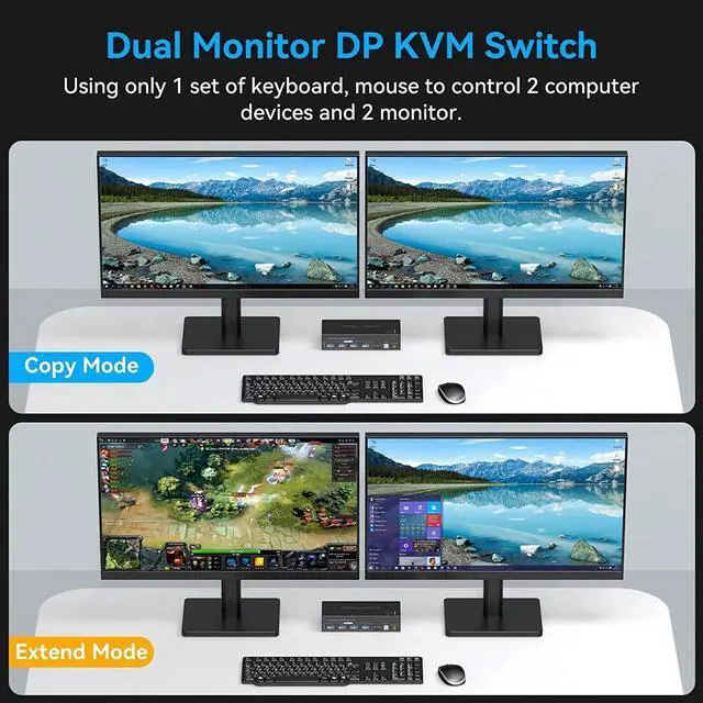 - Dual Monitor Displayport 1.4 KVM Switch can connect 2 computer hosts sharing 1 set of keyboard, mouse and 2 monitors.
