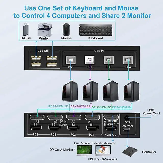 - 1. 4 computers/laptops share one set of keyboard, mouse and dual monitors, and more USB 2.0 peripherals.
