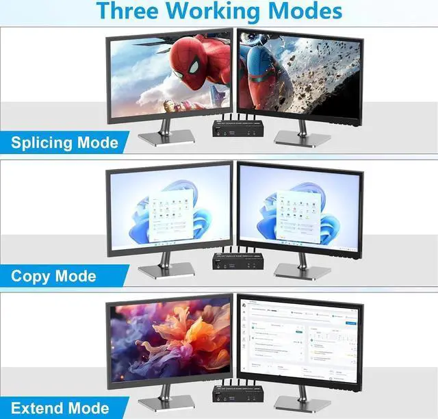 2) The requirement for this KVM to achieve a dual-screen display is that each PC you connect to can support a dual-screen display. This has nothing to do with KVM.
